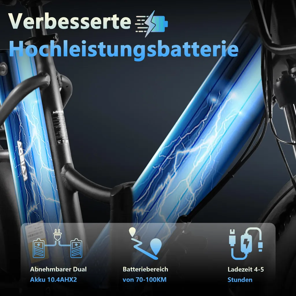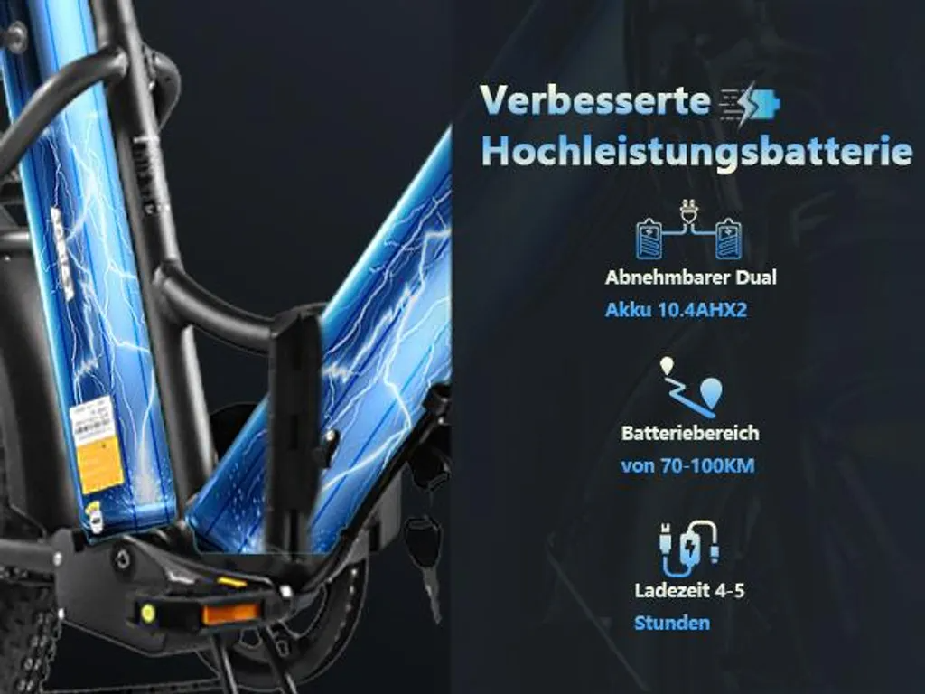 • Mit dem innovativen Doppelakku-Design und einer beeindruckenden Reichweite von bis zu 90 km bist du für jedes Abenteuer bereit! 🔋 Und dank der schnellen 4-5h Ladezeit bist du im Nu wieder startklar.