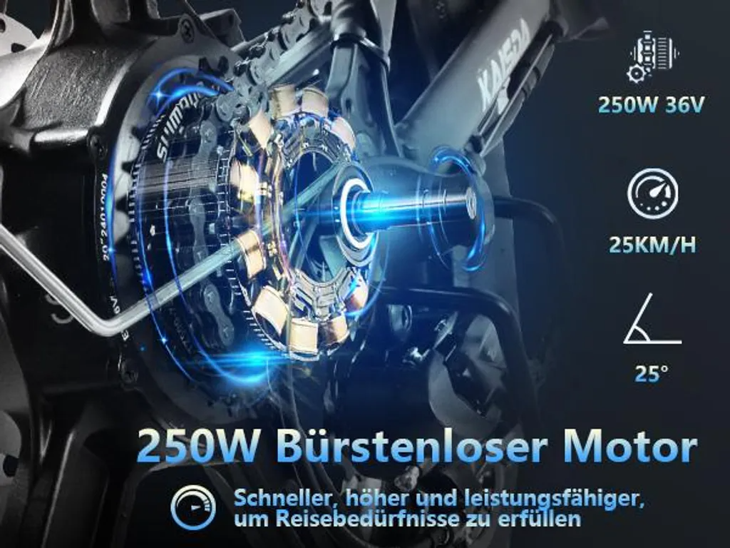 • Erlebe mühelose Fahrten mit dem leistungsstarken 250W Motor, der Steigungen bis 25° meistert, und profitiere von einer beeindruckenden Traglast von bis zu 150 kg. 💪
