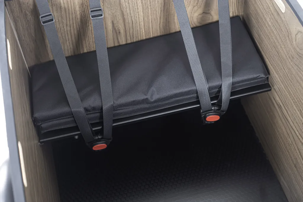 Für den Kindertransport sind gepolsterte Sitze mit Dreipunktgurten vorhanden.