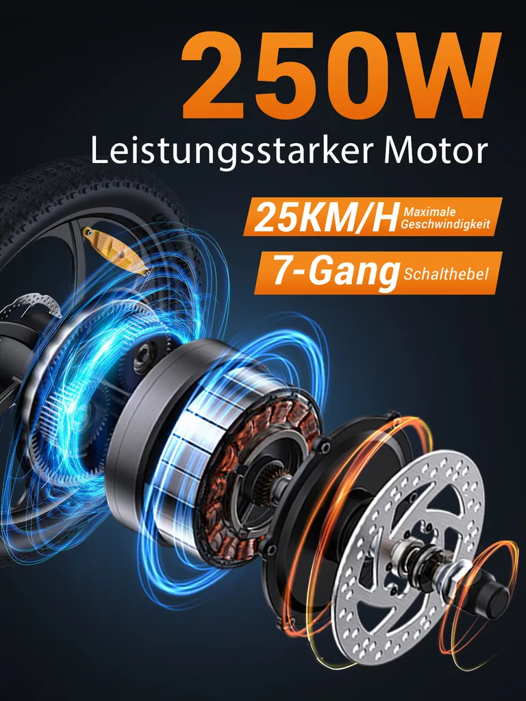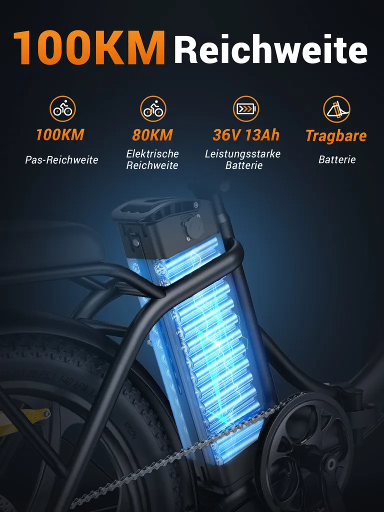 • Erlebe die Power eines leistungsstarken 250W Motors, der dich blitzschnell auf 25 km/h bringt und dir eine beeindruckende Reichweite von bis zu 100 km ermöglicht! 🚀