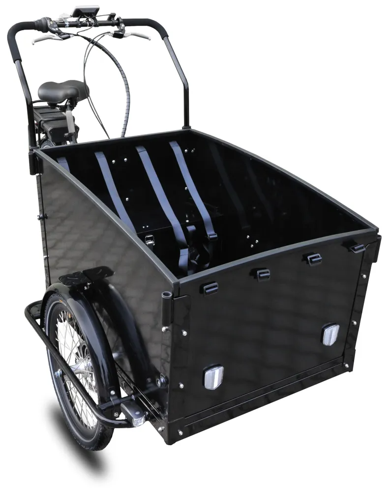 Die Holz-Transportbox des T1 ist umweltschonender als vergleichbare aus Plastik. Zwei gemütlich gepolsterte Sitzbänke bieten vier kleinen Kinder Platz. Die 3-Punkt-Sicherheitsgurte lassen sich gut einstellen und schützen Ihre Lieben. Darüber hinaus verhindert die zusätzliche Bremssperre, dass das Lastenrad rollt, was beim Ein- und Aussteigen Ihrer Kinder viel stabiler ist. Die Bänke sind im Nu nach oben geklappt, so dass Sie noch größere der sperrige Fracht unterbringen können. Gut versteckt unter einer Sitzbank befindet sich eine abschließbare Box, falls Sie einmal etwas Besonderes sicher befördern oder kurzfristig lagern möchten. Selbst bei Regen und Wind brauchen Sie sich keine Sorgen um die Kleinen oder Ihre Waren machen: Zwei optional aufsteckbare Bügel stützen die praktische Regenabdeckung.